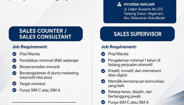 Apakah Anda seorang profesional di bidang penjualan yang memiliki ambisi tinggi untuk sukses di industri otomotif? Hyundai Priangan Timur (PT Hasmo Jaya Makmur) memberikan kesempatan bagi Anda untuk bergabung bersama brand otomotif global yang sedang berkembang pesat di Indonesia. Kami mengundang individu-individu berbakat untuk menjadi bagian dari keluarga besar Hyundai untuk wilayah Tasikmalaya, Ciamis, dan Kota Banjar.