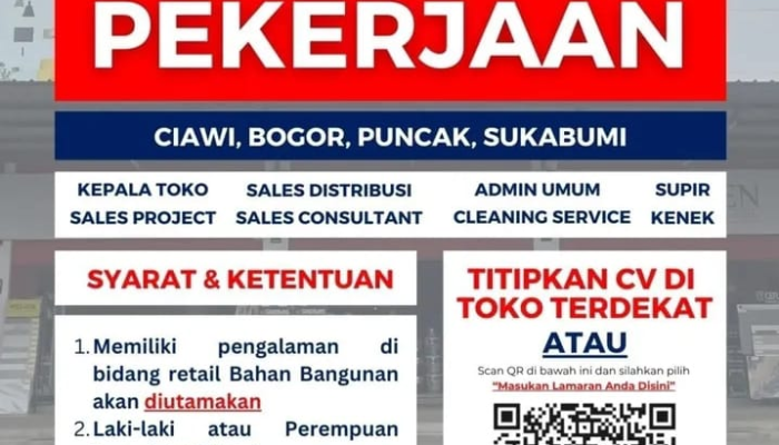 - Pengalaman: Memiliki pengalaman di bidang retail bahan bangunan akan menjadi nilai tambah dan diutamakan.