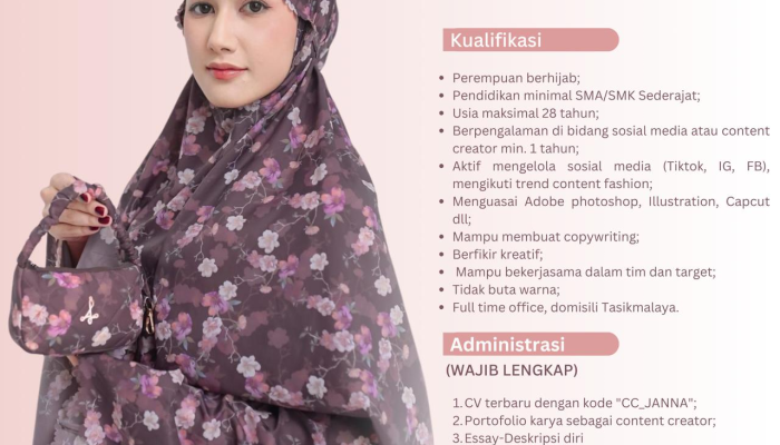 Bergabung dengan Janna Essentials berarti menjadi bagian dari tim yang dinamis dan inovatif dalam industri modest fashion. Jika Anda berdomisili di Tasikmalaya dan ingin menyalurkan bakat Anda di lingkungan kerja yang profesional, inilah saat yang tepat untuk melamar. Simak detail lengkap mengenai kualifikasi dan tata cara pendaftarannya di bawah ini.