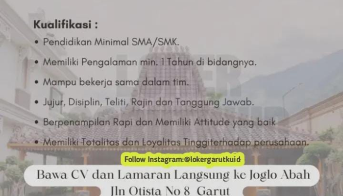 Untuk melamar lowongan kerja di Joglo Abah Garut ini, berikut adalah kualifikasi yang harus dipenuhi: