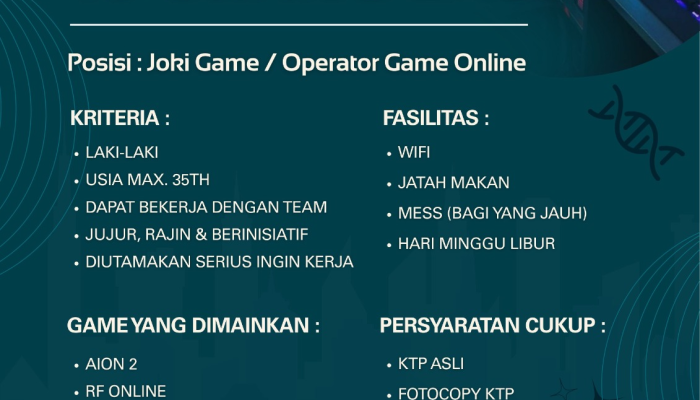 Apakah Anda seorang gamer sejati yang ingin mengubah hobi bermain game menjadi pekerjaan profesional dengan potensi penghasilan yang menjanjikan? Garden Galaxy (Tasikmalaya), salah satu game center ternama di Tasikmalaya, membuka kesempatan emas bagi 10 orang lagi untuk bergabung sebagai Joki Game / Operator Game Online! Jika Anda bersemangat, serius ingin bekerja, dan mahir dalam game-game tertentu, kami mengundang Anda untuk menjadi bagian dari tim yang sudah memiliki lebih dari 80 anggota!