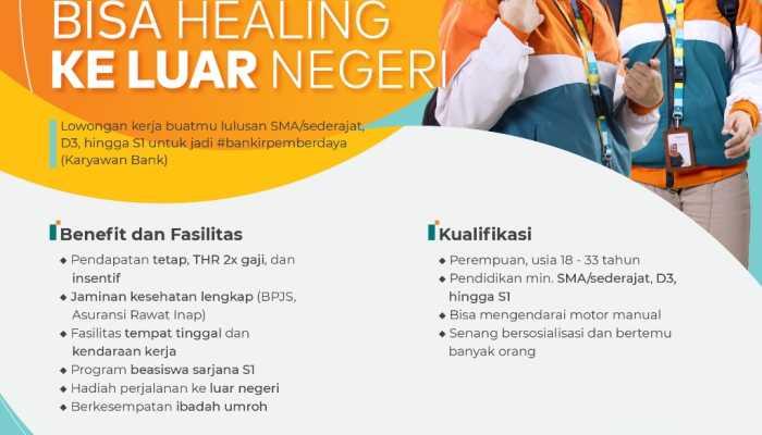 Mencari pekerjaan yang tidak hanya menawarkan gaji stabil, tetapi juga kesempatan luar biasa untuk mengembangkan karir dan berkesempatan untuk healing ke luar negeri? Kesempatan emas telah tiba! Bank Syariah BTPN Tepat membuka rekrutmen besar-besaran untuk posisi Karyawan Bank (Bankir Pemberdayaan) di wilayah Tasikmalaya. Ini adalah peluang emas bagi Anda lulusan SMA/sederajat, D3, hingga S1 yang memiliki semangat tinggi, siap berkontribusi, senang bersosialisasi, dan siap menjadi bagian penting dari perbankan yang berfokus pada pemberdayaan masyarakat. Segera daftarkan diri Anda dan raih karir impian Anda!
