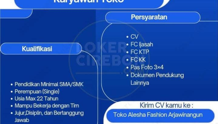 Loker Karyawan Toko Cirebon – Apakah Anda seorang wanita muda yang aktif, disiplin, dan sedang mencari kesempatan berkarir di bidang retail fashion? Toko Alesha Fashion Arjawinangun saat ini sedang membuka lowongan kerja terbaru untuk posisi Karyawan Toko.