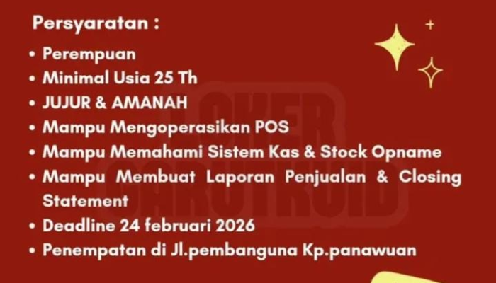 Apakah Anda seorang wanita yang teliti, jujur, dan memiliki pengalaman di bidang retail? Minigrosir sedang mencari talenta berbakat untuk bergabung menjadi bagian dari tim kami sebagai Kasir. Jika Anda berdomisili di Garut dan ingin berkarir di lingkungan kerja yang dinamis, ini adalah kesempatan yang tepat bagi Anda!