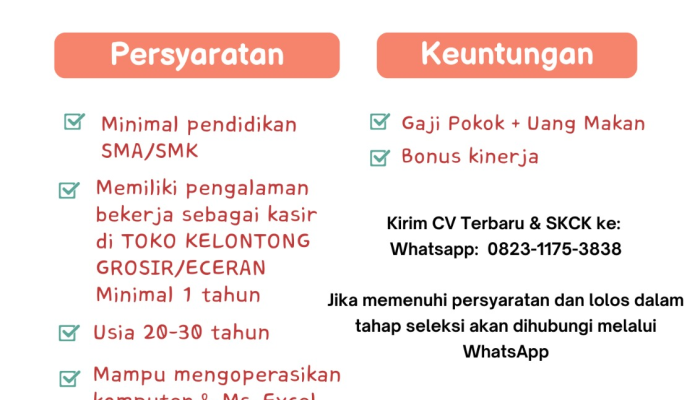 - Pengalaman kerja sebagai kasir di toko grosir/eceran minimal 1 tahun