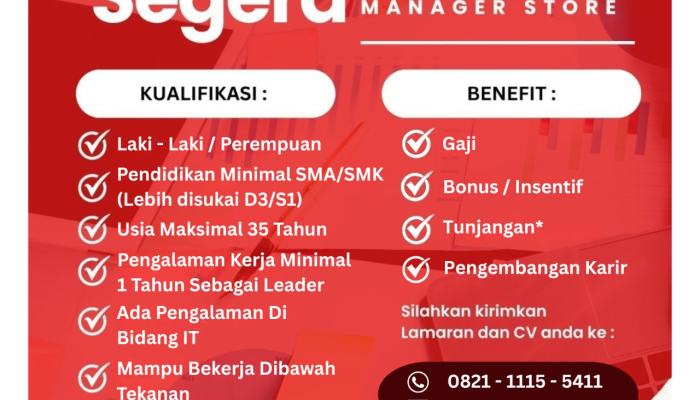Loker Manager Store 2026 – Apakah Anda seorang pemimpin yang berjiwa kompetitif, memiliki pemahaman mendalam di bidang teknologi informasi, dan siap mengelola tim retail yang solid? Pusat Laptop Nusantara, salah satu jaringan retail perangkat komputer terkemuka, saat ini sedang mencari talenta profesional untuk mengisi posisi Kepala Toko / Manager Store. Lowongan ini terbuka untuk penempatan di wilayah strategis Jawa Barat dan Jawa Tengah.