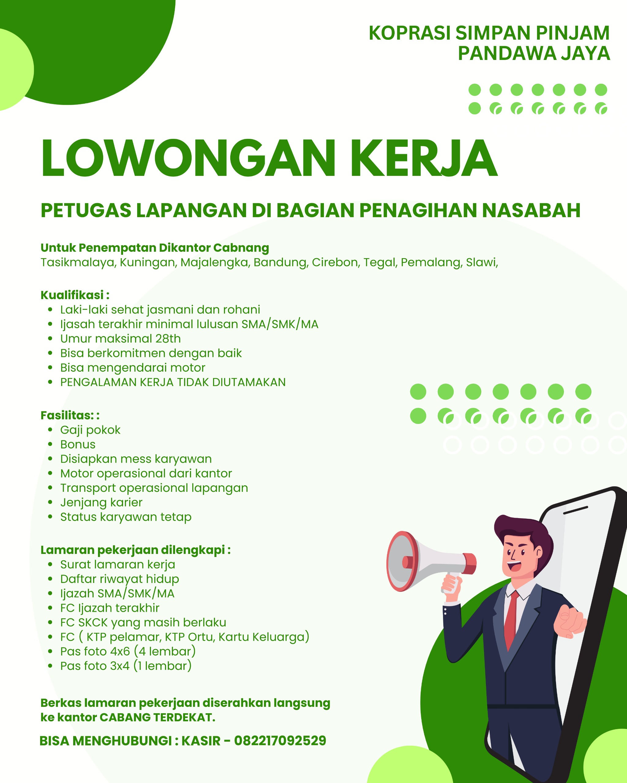 Lokertasikmalaya.ID – Update Info lowongan Kerja 11 Januari 2025, Lowongan Kerja Koprasi Simpan Pinjam Pandawa Jaya