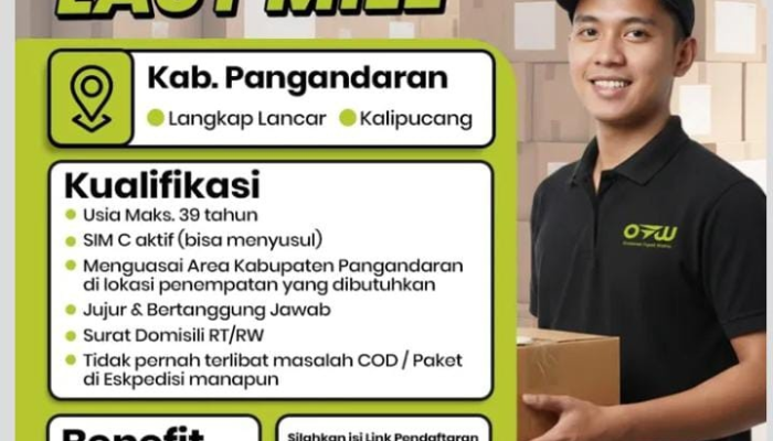Apakah Anda sedang mencari pekerjaan lapangan dengan penghasilan yang bergantung pada produktivitas Anda? OTW (Orderan Tepat Waktu) sedang membuka kesempatan emas bagi Anda untuk bergabung sebagai Kurir Paket Last Mile untuk wilayah Kabupaten Pangandaran. Kami mencari individu yang jujur, bertanggung jawab, dan menguasai medan untuk memastikan setiap paket sampai ke tangan pelanggan dengan tepat waktu.