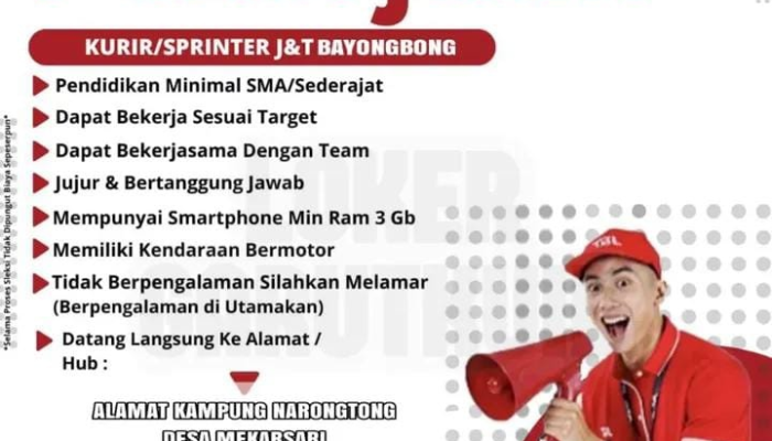 Ingin memiliki penghasilan stabil dengan waktu kerja yang dinamis? J&T Express Bayongbong saat ini membuka kesempatan karir bagi Anda yang berdedikasi tinggi untuk posisi Kurir/Sprinter. Bergabunglah dengan salah satu perusahaan ekspedisi terbesar di Indonesia!
