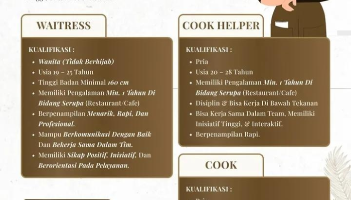 • Memiliki pengalaman minimal 1 tahun di bidang serupa (Restaurant/Cafe).