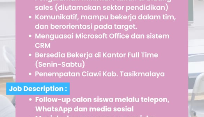 - Pengalaman minimal 1 tahun di bidang sales (diutamakan di sektor pendidikan)