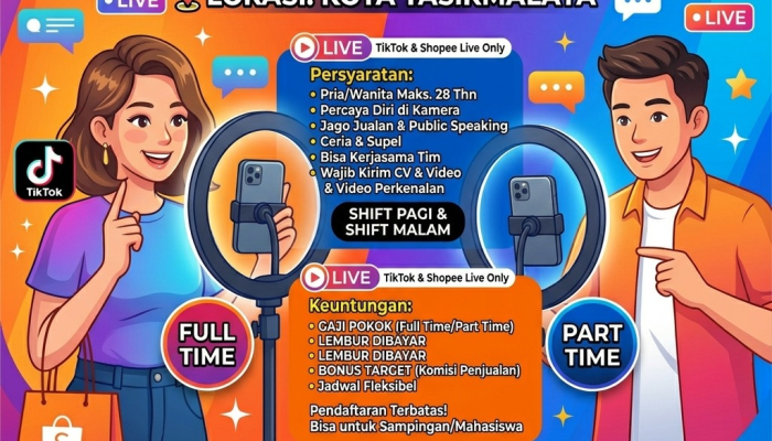 Dunia belanja daring (online shopping) terus berkembang pesat, dan kini kesempatan untuk menjadi bagian dari tren tersebut ada di depan mata Anda! Kami membuka kesempatan emas bagi Anda yang kreatif, enerjik, dan percaya diri untuk bergabung sebagai Live Streamer Host. Jika Anda mencari lingkungan kerja yang dinamis dengan fleksibilitas tinggi, posisi ini adalah jawaban yang tepat untuk karier Anda tahun ini.