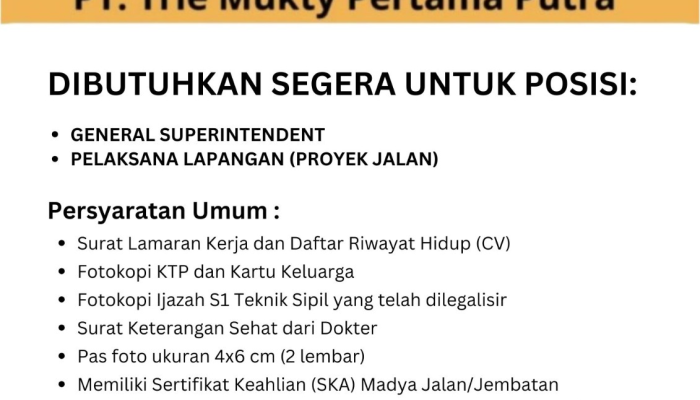 PT. Trie Mukty Pertama Putra, perusahaan yang bergerak di bidang konstruksi, membuka kesempatan berkarir untuk posisi: