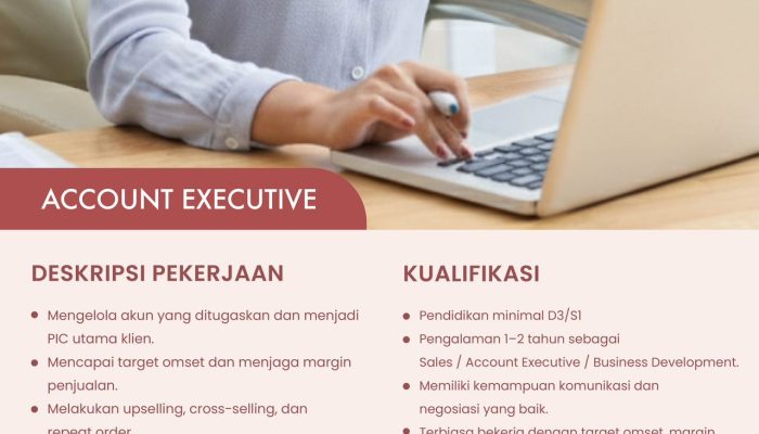 - Kualifikasi Utama: Pendidikan minimal D3/S1, pengalaman 1-2 tahun di bidang Sales/Account Executive, dan kemampuan komunikasi yang unggul.