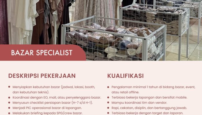- Kualifikasi Utama: Pengalaman minimal 1 tahun di bidang bazar/event, sanggup bekerja mobile, dan mampu berkoordinasi dengan vendor/EO.