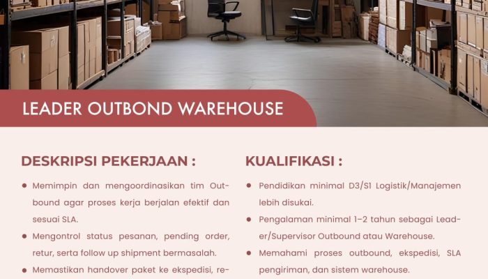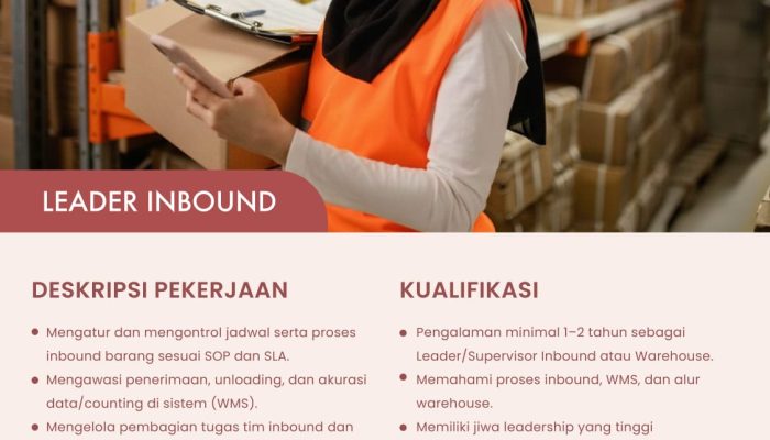 - Kualifikasi Utama: Pengalaman 1-2 tahun sebagai Leader/Supervisor Inbound atau Warehouse, memahami sistem WMS, dan teliti.