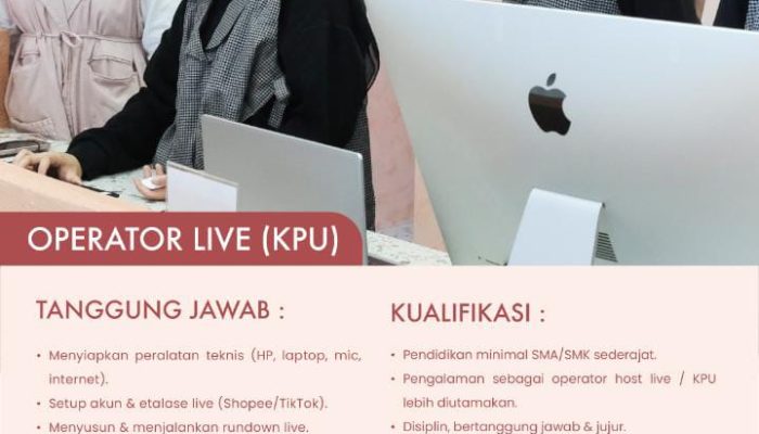 - Kualifikasi Utama: Pendidikan minimal SMA/SMK sederajat, menguasai teknis live streaming, disiplin, dan bersedia bekerja sistem shifting.