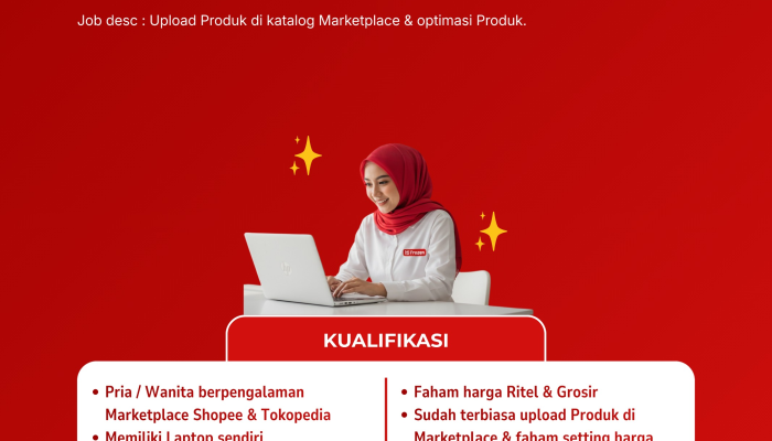 - Kualifikasi: Pria/Wanita, paham harga ritel & grosir, menguasai Canva, memiliki laptop sendiri. Terbuka bagi penyandang difabel.