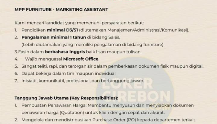 Lowongan Kerja Marketing Assistant MPP Furniture 2026