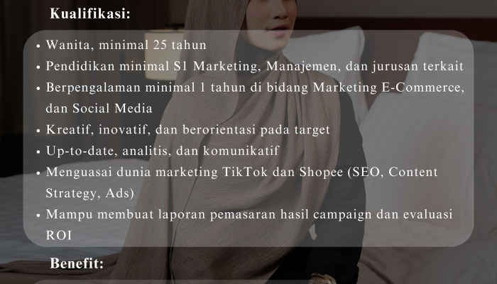 - Pengalaman: Berpengalaman minimal 1 tahun di bidang Marketing E-Commerce dan Social Media.