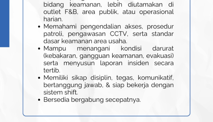 - Pengalaman: Min. 1–2 tahun di bidang keamanan (diutamakan area F&B/publik).