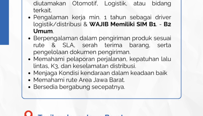 - Keahlian Khusus: * Driver: Wajib memiliki SIM B1 atau B2 Umum.