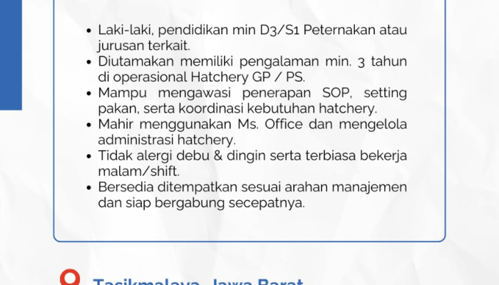 - Pendidikan: Variatif mulai dari SMA/SMK (Driver & Security), SMK/D3/S1 Teknik (Maintenance), hingga D3/S1 Peternakan/Kedokteran Hewan (Posisi Managerial & Supervisor).