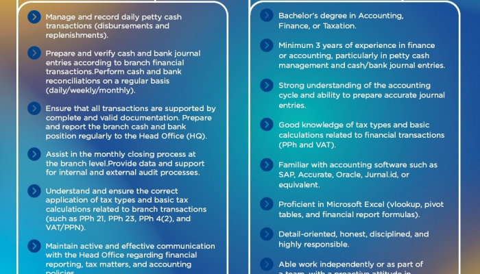 - Pendidikan minimal S1 Akuntansi, Manajemen, atau Administrasi.