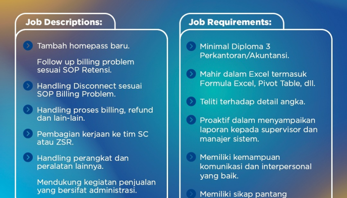 Kami mencari talenta profesional yang proaktif, berorientasi pada hasil, dan siap memberikan kontribusi terbaik bagi kemajuan teknologi komunikasi di Indonesia.