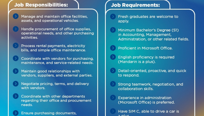 - Menangani pengadaan perlengkapan kantor dan kebutuhan operasional lainnya.