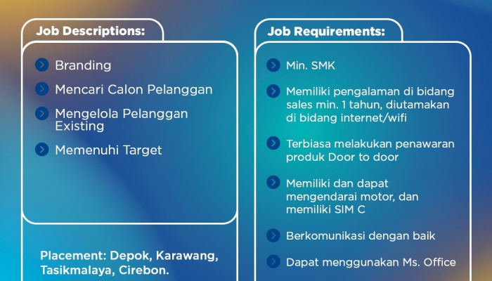 - Pengalaman minimal 1 tahun di bidang sales (diutamakan bidang internet/WiFi).