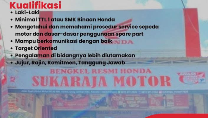 Apakah Anda seorang mekanik sepeda motor yang terampil, jujur, dan siap bekerja? Ingin berkarir di bengkel resmi Honda yang terpercaya? Jika iya, Bengkel Resmi Honda Sukaraja Motor membuka kesempatan emas untuk Anda! Kami sedang mencari seorang Mekanik yang berdedikasi untuk bergabung dengan tim kami di Tangerang.