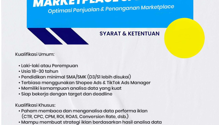 - Tugas Utama: Optimasi penjualan dan penanganan seluruh kegiatan di platform marketplace.