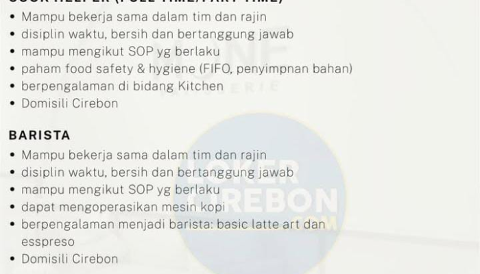 Apakah Anda memiliki gairah di dunia kuliner dan pelayanan? Mune Patisserie, salah satu destinasi pastry populer di Cirebon, sedang membuka kesempatan bagi Anda untuk bergabung dalam tim mereka yang dinamis. Jika Anda adalah individu yang rajin, disiplin, dan ingin mengembangkan karir di bidang F&B, ini adalah kesempatan yang tepat untuk Anda.