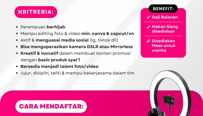 Anda adalah seorang Muslimah berhijab yang kreatif, inovatif, dan mahir dalam membuat konten visual serta video pendek yang menarik? Ingin berkarir sambil mendapatkan fasilitas Mess untuk wanita dan Gaji Bulanan yang terjamin?