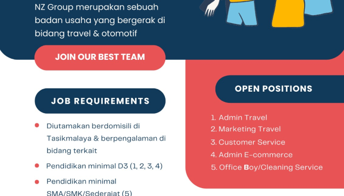NZ Group, sebuah badan usaha yang bergerak di bidang travel dan otomotif, sedang membuka kesempatan karir bagi Anda yang berdomisili di Tasikmalaya! Jika Anda adalah individu yang jujur, disiplin, dan bertanggung jawab, inilah saatnya untuk bergabung dengan tim profesional kami. Kami mencari kandidat terbaik untuk mengisi berbagai posisi menarik dan berkembang bersama kami.