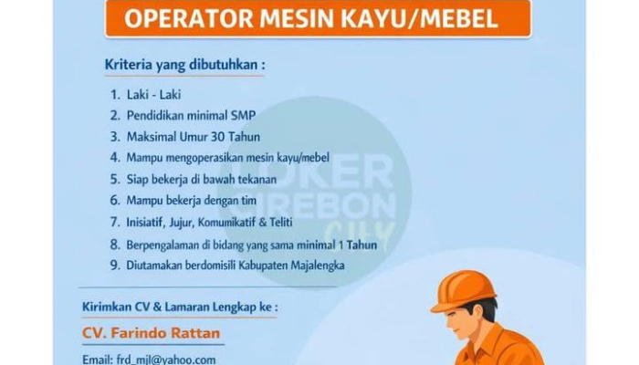 Apakah Anda memiliki keahlian teknis dalam mengoperasikan mesin kayu atau mebel? CV Farindo Rattan, sebuah perusahaan yang sedang berkembang pesat di bidang distribusi dan retail bahan baku industri, saat ini membuka lowongan kerja untuk posisi Operator Mesin Kayu/Mebel untuk penempatan di wilayah Majalengka.