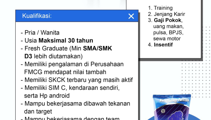 Apakah Anda seorang pejuang lapangan yang tangguh, memiliki jiwa kepemimpinan, dan ingin berkarir di industri FMCG (Fast Moving Consumer Goods)? Pandowo Utomo Food, produsen camilan ternama Kacang Cap Gajah, saat ini membuka kesempatan karir strategis untuk penempatan di Tasikmalaya. Kami mencari individu yang berorientasi pada target dan siap berkembang bersama jaringan distribusi kami yang luas.