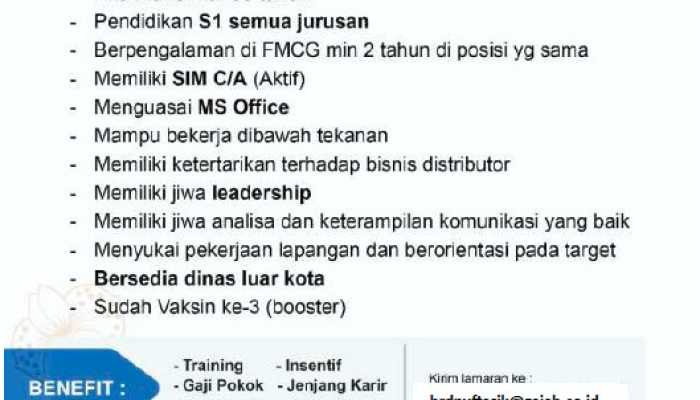 - Pengalaman: Minimal 2 tahun di posisi yang sama pada bidang FMCG.