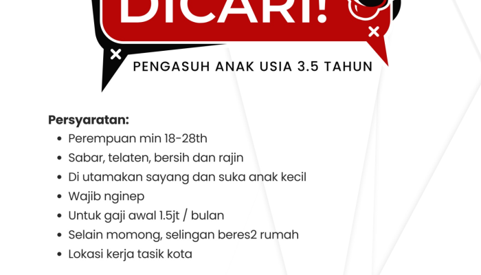 Apakah Anda seorang penyayang anak yang sedang mencari pekerjaan dengan lingkungan kekeluargaan di Tasikmalaya? Saat ini, sebuah kesempatan kerja dibuka bagi Anda yang memiliki jiwa sabar dan telaten untuk bergabung sebagai pengasuh anak di wilayah Tasik Kota. Pekerjaan ini sangat cocok bagi Anda yang mencari kestabilan karir dengan sistem kerja menginap. Mari simak detail lengkapnya di bawah ini!
