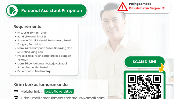 Anda seorang Pria lulusan S1 dari jurusan Teknik Industri, Peternakan, Teknik Pangan, atau Pertanian yang proaktif, mahir Public Speaking dan MS Office? Tamanhati Group (TMH Group), yang menaungi PT. Tamanhati Berkah Sejahtera (Sukahati Chicken Processing), mengundang Anda untuk bergabung sebagai Personal Assistant (PA) Pimpinan. Jika Anda bersemangat, terbiasa dengan tekanan, dan siap ditempatkan di Tasikmalaya, segera kirimkan lamaran Anda!