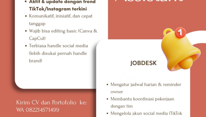 Apakah Anda seorang yang kreatif, terorganisir, dan selalu mengikuti tren media sosial terbaru? Saat ini, kesempatan emas telah dibuka bagi Anda yang ingin mengembangkan karir sebagai Personal Assistant. Posisi ini sangat cocok bagi Anda yang memiliki kemampuan komunikasi yang baik, proaktif, dan mahir dalam mengelola konten digital. Jangan lewatkan kesempatan untuk bekerja langsung dalam mendukung aktivitas operasional dan kreatif owner di lingkungan kerja yang dinamis.