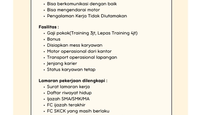 Ini adalah kesempatan bagi Anda yang ingin langsung berkarya tanpa terhambat oleh pengalaman kerja! Kami mencari individu yang berani menghadapi tantangan di lapangan, memiliki kemampuan komunikasi yang baik, dan siap menjadi bagian penting dari pertumbuhan koperasi. Dapatkan gaji pokok, bonus, fasilitas mess, hingga status karyawan tetap! Mari maju dan berkembang bersama KSP Pandawa Jaya.