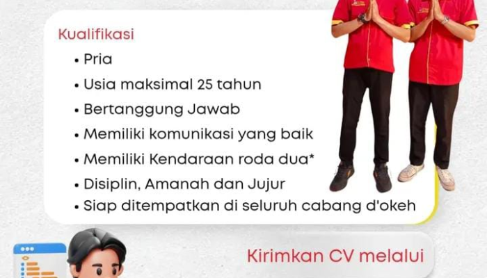 Apakah Anda seorang pria muda yang bertanggung jawab, disiplin, dan memiliki jiwa kepemimpinan? Inilah kesempatan emas Anda! D’Okeh, merek kuliner dengan slogan “Okeh Rasanya, Okeh Harganya,” sedang mencari individu yang berdedikasi untuk mengisi posisi sebagai PIC Outlet (Person In Charge Outlet). Jika Anda siap ditempatkan di seluruh cabang D’Okeh dan berdomisili di Kabupaten Garut, segera kirimkan CV Anda!