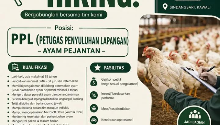 - Bersedia bekerja penuh di lapangan dan terlibat langsung di area kandang.
