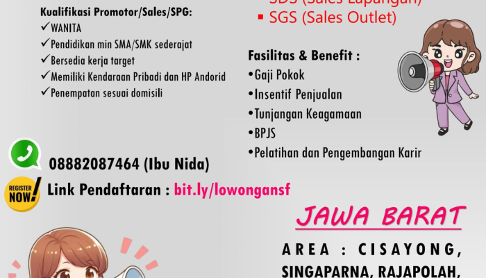 Apakah Anda seorang wanita yang energik, berorientasi pada target, dan memiliki minat besar di bidang penjualan dan promosi? Inilah kesempatan karir menarik untuk Anda! XLSMART smartfren membuka kesempatan bagi Anda untuk bergabung sebagai Promotor dengan posisi spesifik SDS (Sales Lapangan) dan SGS (Sales Outlet). Jika Anda siap ditempatkan sesuai domisili di berbagai area strategis di Jawa Barat, khususnya Tasikmalaya dan sekitarnya, segera kirimkan lamaran Anda!