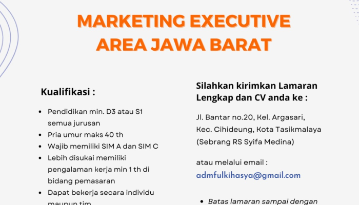 PT. Fulki Hasya mencari seorang profesional yang bersemangat dan berorientasi pada target untuk mengisi posisi Marketing Executive yang akan bertanggung jawab penuh atas aktivitas pemasaran, penjualan, dan pengembangan pasar untuk produk peralatan komersial dan medis di seluruh area Jawa Barat. Kandidat yang terpilih harus mampu bekerja secara mandiri maupun dalam tim.
