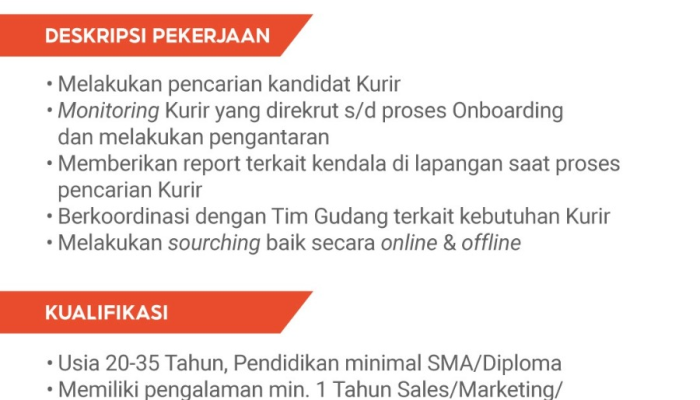 • Pengalaman: Memiliki pengalaman kerja minimal 1 (satu) tahun di bidang terkait, seperti Sales, Marketing, Transportasi, Logistik, atau Kurir.