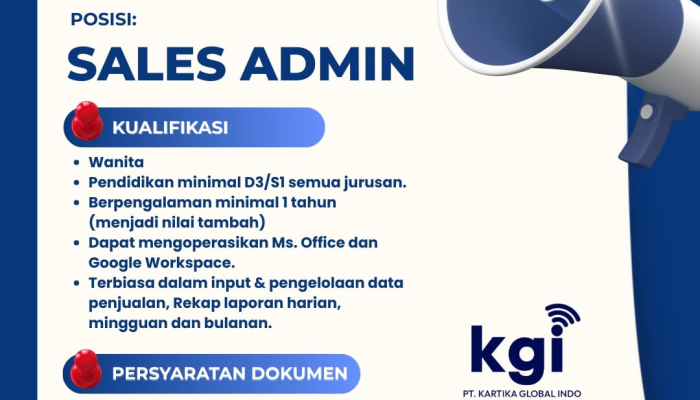 Apakah Anda seorang profesional administrasi yang detail dan terbiasa mengelola data penjualan? PT Kartika Global Indo (KGI) saat ini sedang membuka kesempatan karir menarik untuk mengisi posisi Sales Admin. Kami mencari kandidat wanita yang kompeten, cekatan, dan siap berkontribusi dalam mendukung pertumbuhan bisnis kami melalui pengelolaan data yang akurat dan sistematis.