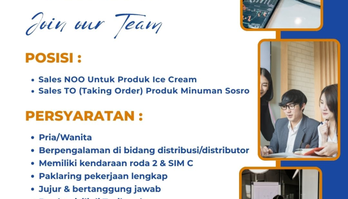 - Sales NOO (Es Krim): Bertanggung jawab untuk mencari dan membuka outlet baru untuk produk es krim. Anda akan bekerja untuk memperluas jangkauan pasar dan meningkatkan volume penjualan.